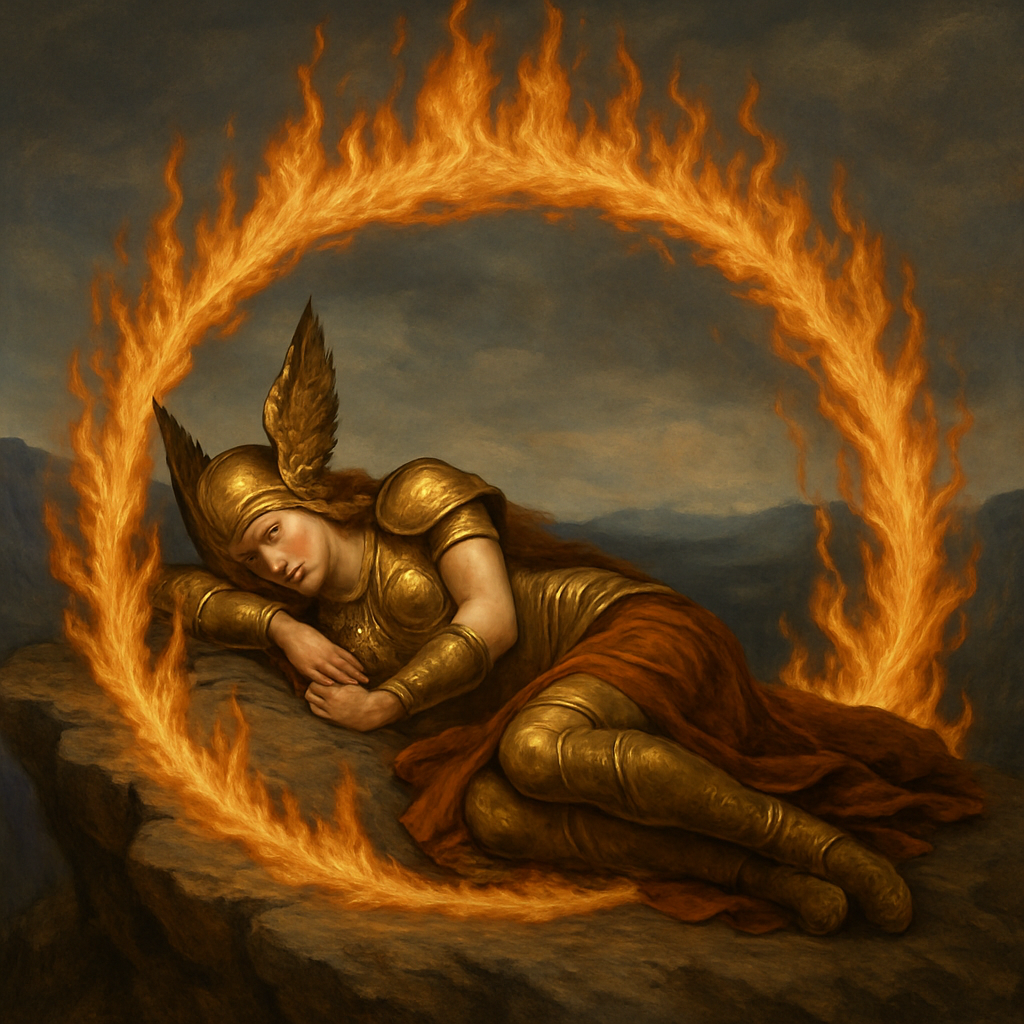 Essa desobediência foi vista como uma afronta gravíssima à autoridade do Pai de Todos. Como castigo, Odin a despojou de sua imortalidade e de seus poderes de Valquíria, transformando-a em uma mulher mortal. Para intensificar a punição, ele a condenou a um sono profundo e mágico. Ela foi colocada em uma montanha isolada, e um círculo intransponível de fogo mágico, muitas vezes chamado de “fogo da barreira” ou “fogo de Valhalla”, foi conjurado ao seu redor. Essa barreira de chamas só poderia ser atravessada pelo mais bravo e destemido dos heróis. A maldição também incluía que ela se casaria com o primeiro homem que a despertasse. Esta punição não apenas humilhou Brunhilde, mas também estabeleceu as bases para os eventos dramáticos que a conectariam a Sigurd, o grande herói, e a um destino trágico. O fogo se tornou um símbolo de seu isolamento e do teste que seu futuro salvador teria que enfrentar.